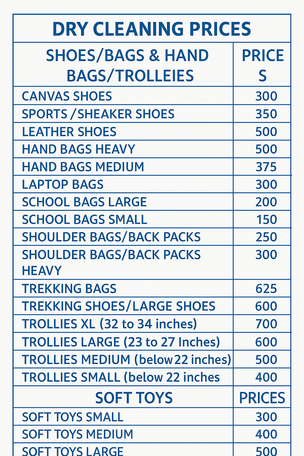 The price varies among several fabrics. However, the cost of Bags and Hand Bags Cleaning services would range from Rs 200-500.